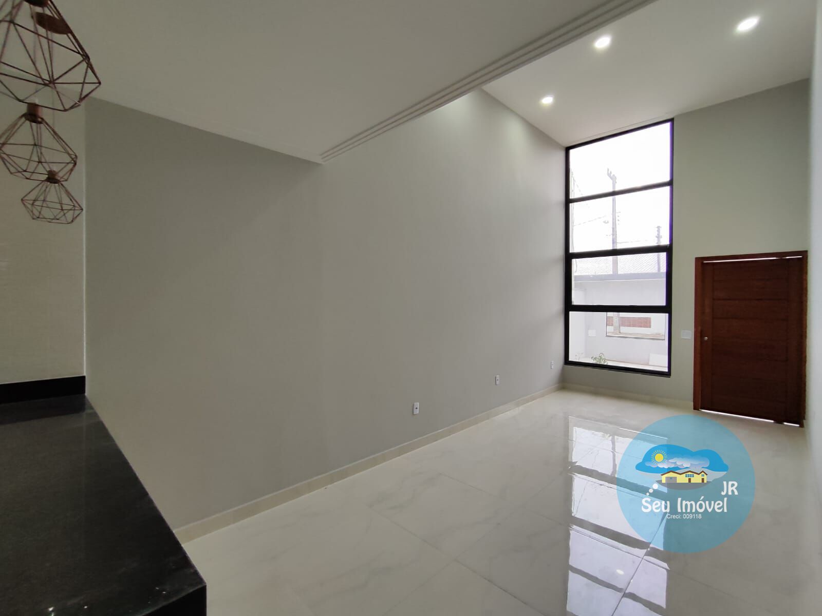 ✔️ Sala ampla com pé-direito duplo – charme, iluminação e imponência!