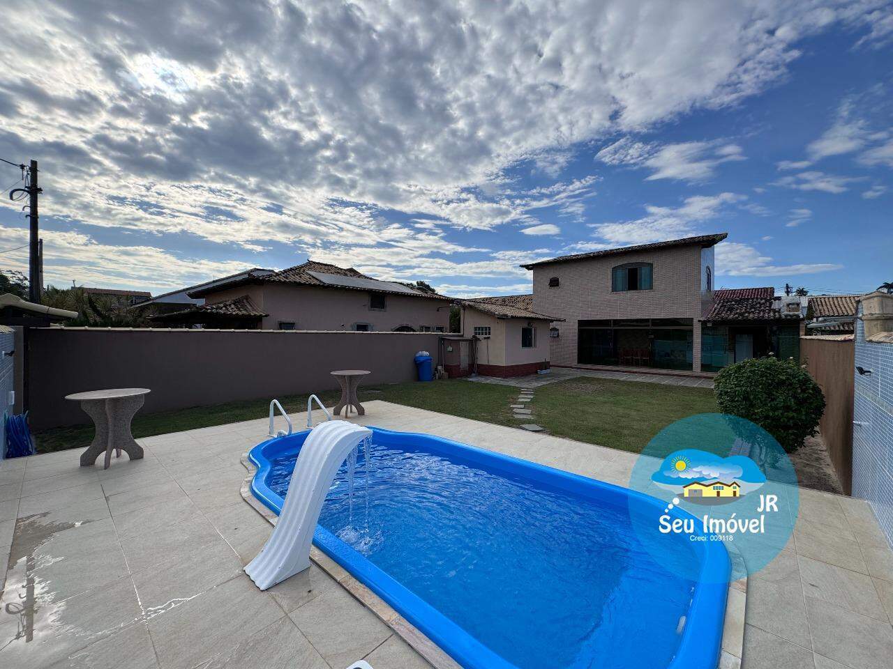 Área de lazer completa com amplo quintal gramado, piscina, churrasqueira, sala de vídeo, banheiros e, no andar superior, um grande espaço multifuncional, atualmente utilizado como escritório e quarto de hóspedes.