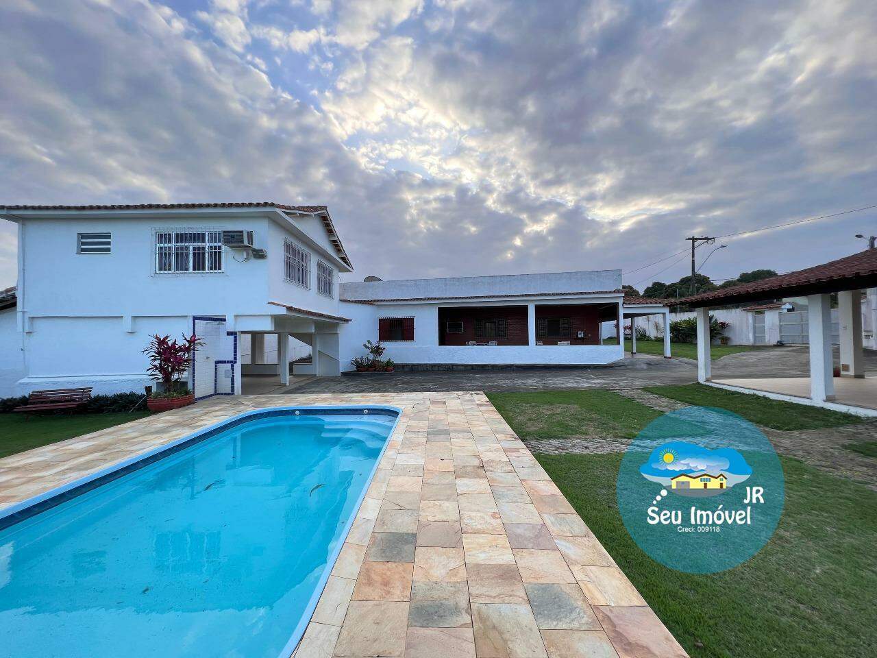 Salão grande com churrasqueira, piscina, 2 banheiros e uma casa para apoio.